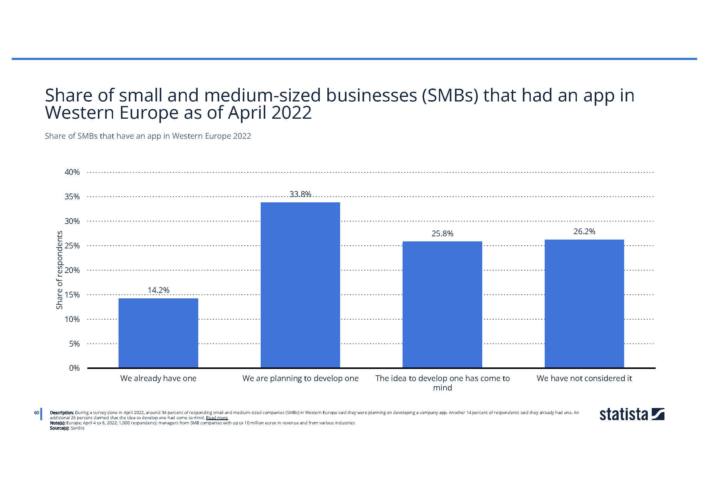 It's no surprise that businesses are responding to market demand. A survey conducted by Statista in April 2022 revealed that in Western European countries, 14% of small and medium-sized enterprises (SMEs) with a turnover up to 10 million EUR already had a mobile application. Additionally, another 34% of SMBs were planning to develop an app, and a further 26% were considering it. [3]