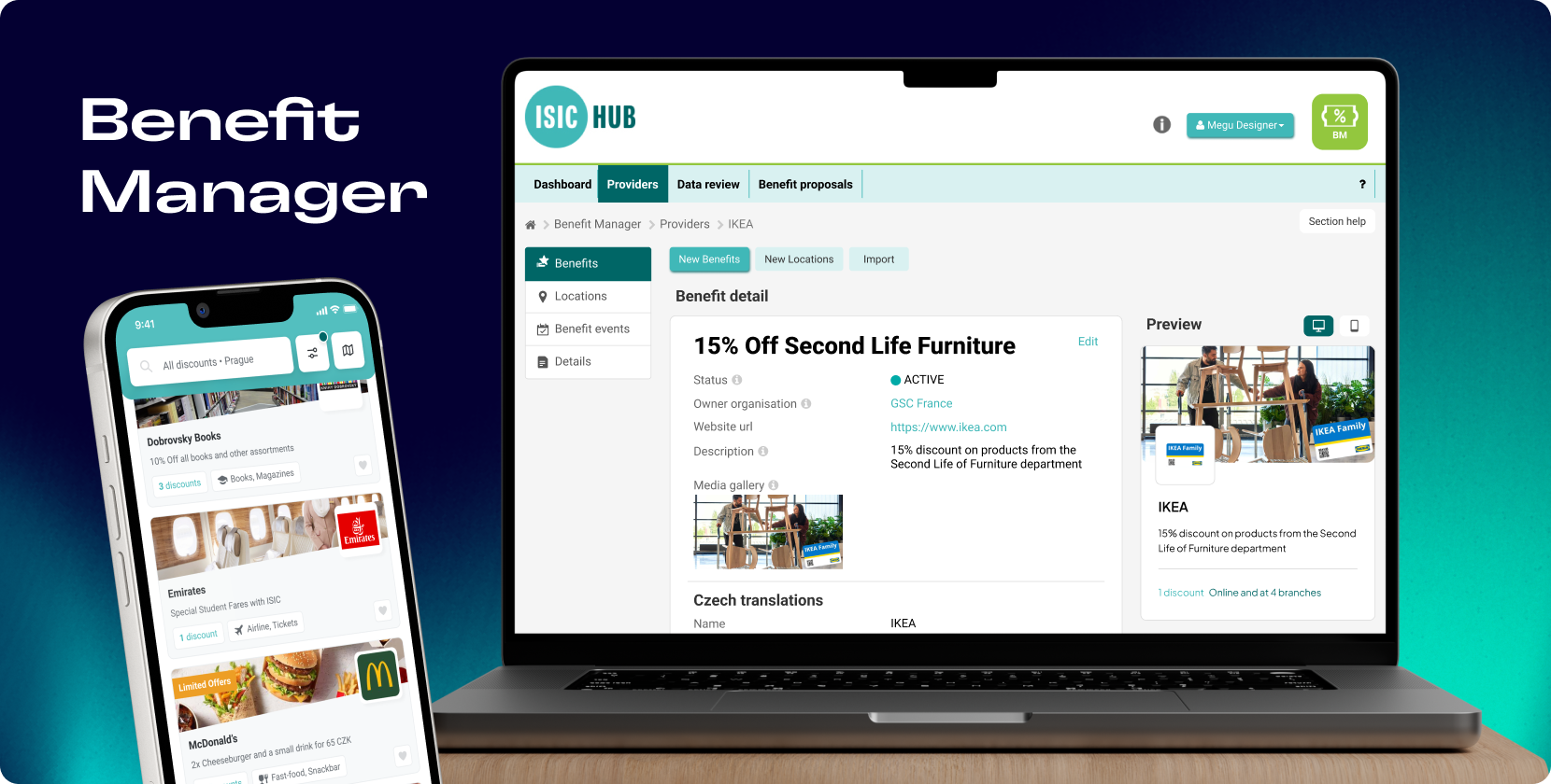 When talking about ISIC, we cannot omit Benefit Manager. It is a tool for managing ISIC partners – shops, institutions, and e-shops – through which new discounts, campaigns, and profiles can be easily and clearly added directly into the app. So it’s not just a mobile app, but an entire ecosystem that is currently undergoing a comprehensive redesign.