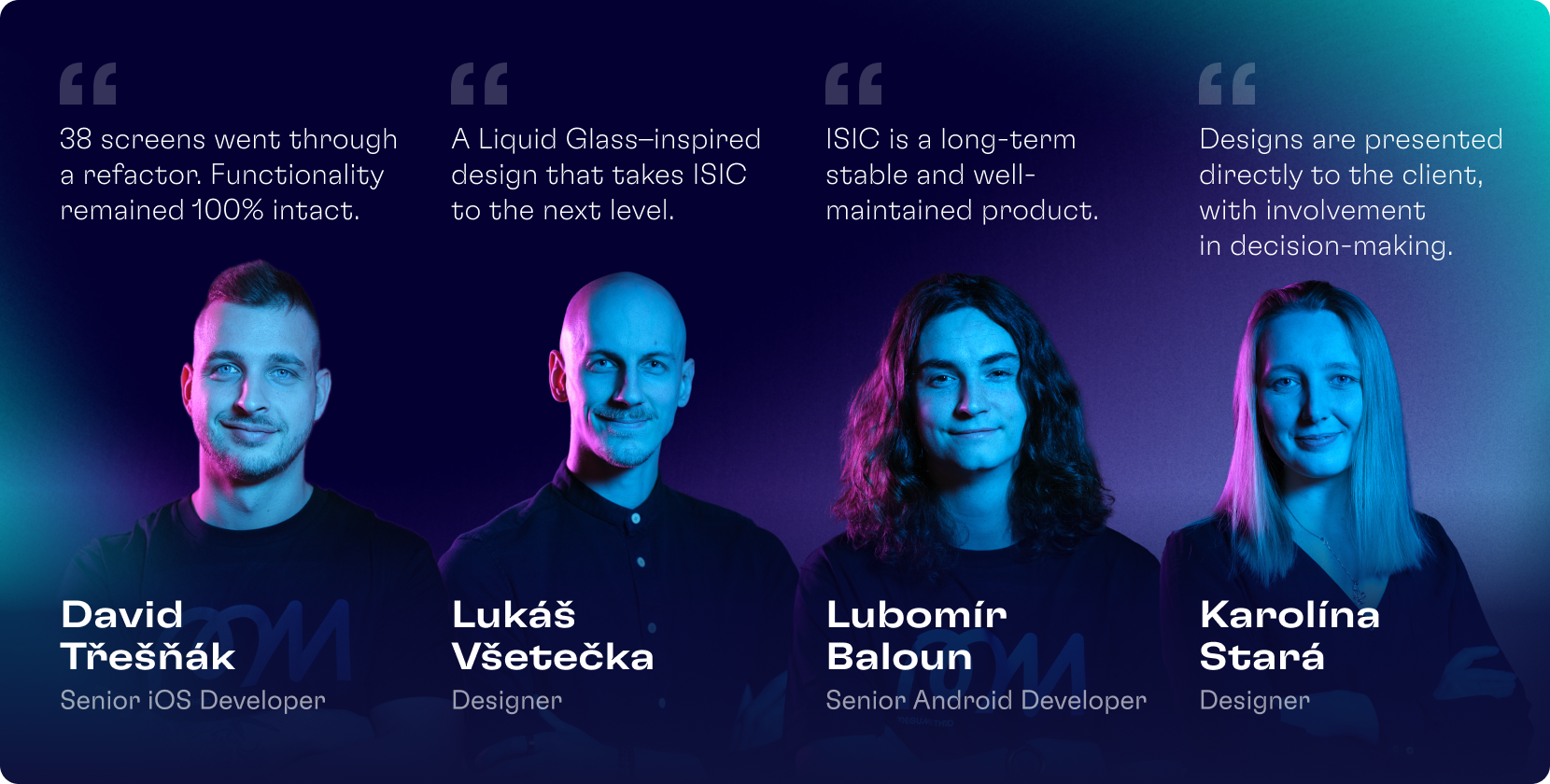 “Responsibility for maximum code safety is something you learn very quickly on ISIC. With a high number of users and a high number of app launches, you realize that even the smallest mistake in logic or concurrency will show up.” David Třešňák, Senior iOS Developer